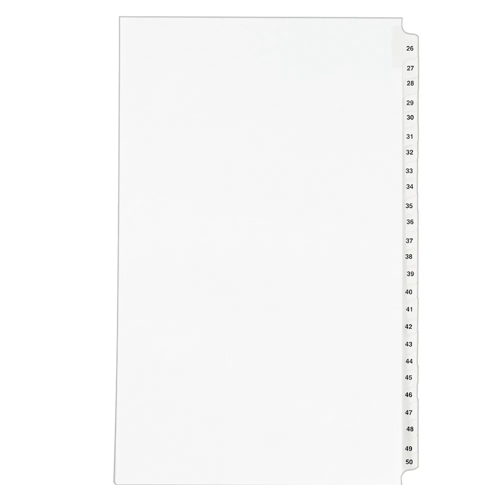 You have the right to organized and professional-looking files. This Standard Collated Legal Divider Set features Tabs 26-50 so it’s perfect for index briefs, legal exhibits, mortgage documentation files and more. 8-1/2″ x 14″ white paper stock with clear, Rip Proof(TM) reinforced tabs are preprinted on both sides using Helvetica bold type for ease of use, and the unpunched binding edge gives you the freedom to fit practically any binding system. Here’s evidence these dividers will do your files justice.