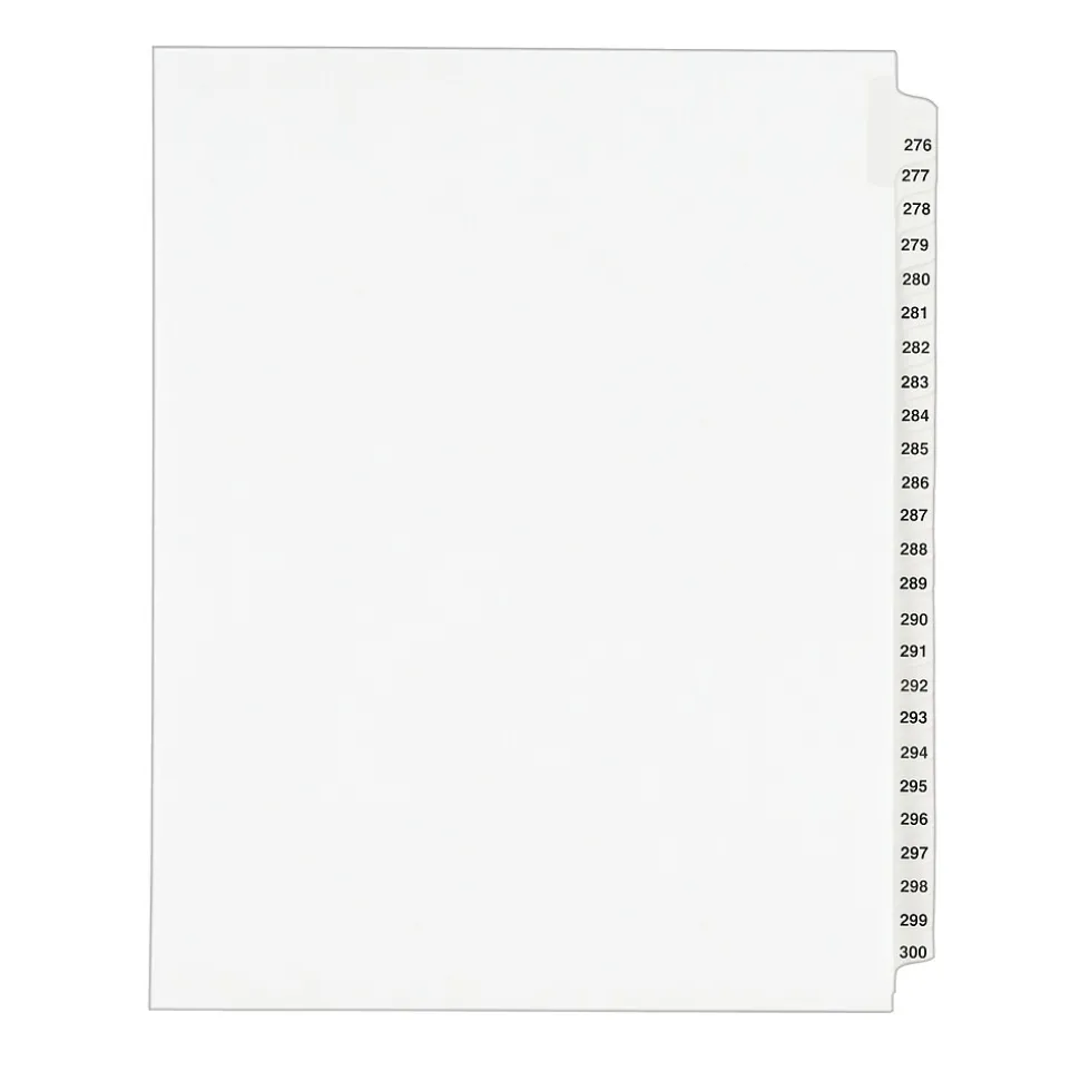 You have the right to organized and professional-looking files. This Standard Collated Legal Divider Set features Tabs 276-300 so it’s perfect for index briefs, legal exhibits, mortgage documentation files and more. White paper stock with clear, Rip Proof(TM) reinforced tabs are preprinted on both sides using Helvetica bold type for ease of use, and the unpunched binding edge gives you the freedom to fit practically any binding system. Here’s evidence these dividers will do your files justice.