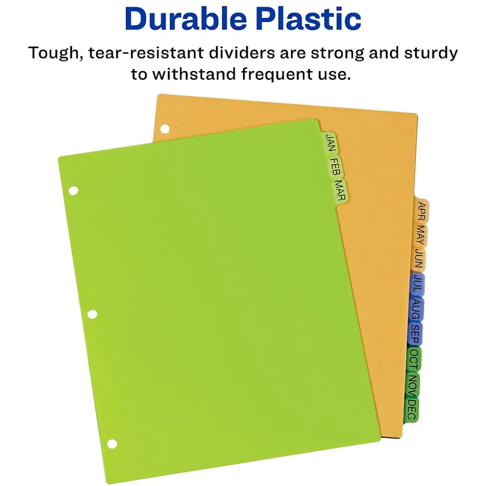 Make sure you keep all your important documents in order the whole year through with Avery Jan-Dec Binder Dividers with tabs. Each plastic divider is made of durable, tear-resistant PVC-free plastic designed to hold up to frequent, everyday use. The assorted colors make the page dividers perfect for color coding by quarter, and the divider tabs are pre-printed with each month on both sides for quick and easy identification at just a glance. Tabbed dividers are pre-punched with 3 holes and ready for immediate use in any standard 3 ring binder. This 12 tab set of Jan-Dec 3 ring binder dividers is great for your month-to-month organization projects at home, work or school. Ensure that you keep up with your records, receipts, paperwork and more throughout the year by using these durable plastic dividers for homework organization, personal finance planning, recipe binder dividers, journaling, as a coupon organizer, or for anything else that needs sorting.