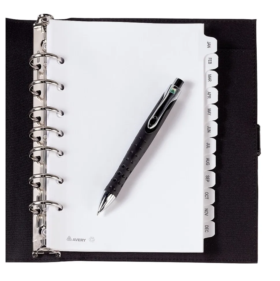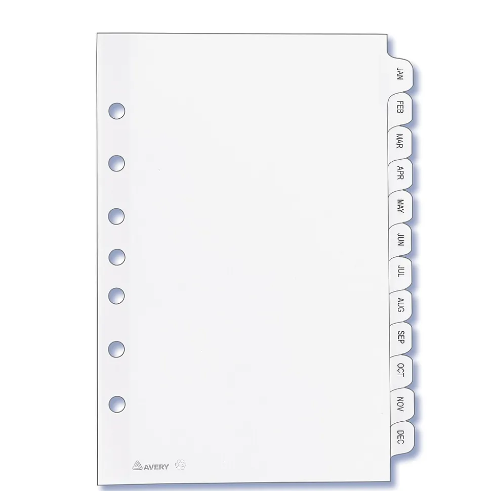 Get organized with these Mini Pre-printed Dividers. The small size is perfect for dividing mini binders or planners. The handy pre-printed tabs give you more versatility, and the clear reinforced binding edge and tabs offer greater durability. Quickly find the section you are looking for with easy-to-read black lettering. For easy reference at a glance, our pre-printed dividers spell it out for you. These dividers are seven hole-punched for 5-1/2″ by 8-1/2″ small format binders and organizers. Tab Style: 12-Tab; Tab Color(s): White; Index Divider Size: 8 1/2 x 5 1/2; Form Quantity: 1.