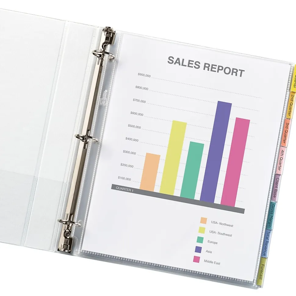 Bring a professional look to reports, proposals or other document collections with these eight-tab sheet protectors. The multicolor tabs make it easy to find papers stored inside binders, while the durable polypropylene construction stands up to frequent handling. Each of these Avery Protect ‘n Tab sheet protectors features prepunched edges and a top-loading design for simple setup.