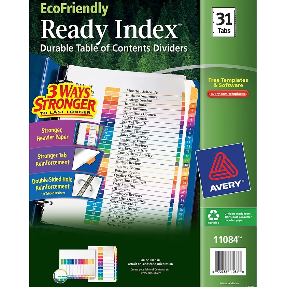Easily organize your binder and stay environmentally friendly with 1 set of Avery Ready Index Eco-Friendly of 31-Tab Binder Dividers. For the environmentally conscious organizer, these eco-friendly paper dividers are made from 100% post-consumer recycled paper. The Tab dividers’ packaging is even made from 50% recycled material. Create and print your own customized section titles and graphics onto the table of contents sheet. The multicolored binder dividers with tabs are preprinted and individually numbered 1-31 for easy organization. No extra tab inserts or labels are needed. Tearing your page dividers can ruin a once functional project binder. Luckily, these durable dividers for 3 ring binder are designed with heavy weighted paper. They also include reinforced extended tabs and double-sided hole reinforcement. Use your favorite binder with these 3 hole punch dividers. The table of contents sheet is compatible with both inkjet and laser printers. Use the tab dividers for school projects, professional binders, or a budget planner book.