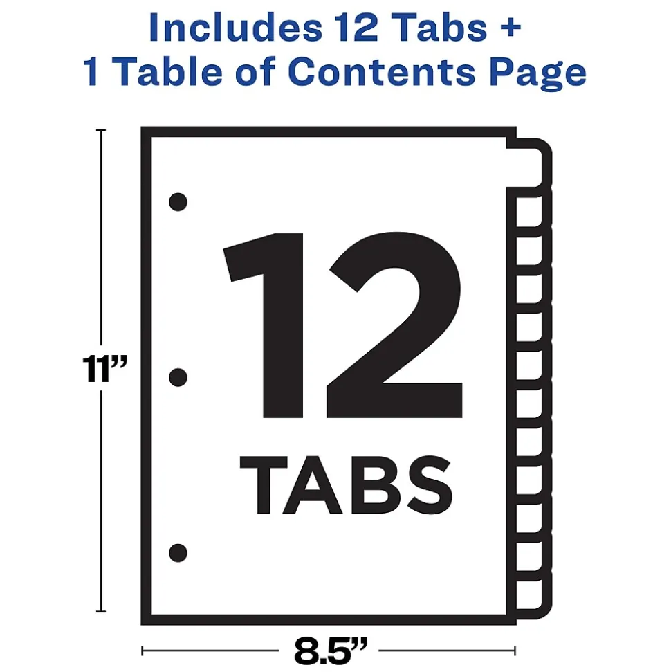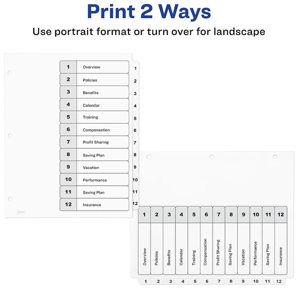 Organize your projects in moments with Avery Ready Index binder dividers. Each white tab is preprinted for a professional appearance. Print your own custom section titles and images onto the table of contents sheet without worrying about labels or inserts.Whether you’re creating planners for classes or hosting a presentation, these dividers are ideal for getting everything sorted.1 set of 12 divider are included with each sheet measuring 8-1/2″x11″. The 3 binder holes are reinforced on both sides of the heavyweight sheet to prevent creasing and tearing. Each divider tab includes additional reinforcement along the edge of each page to distribute stress and resist folding.The printable table of contents is dual compatible with both laser and inkjet printers.This sheet can also be printed in either portrait or landscape so that your projects can be displayed in any orientation.Just flip the sheet to view the other layout on the opposite side.Try out free templates for these dividers and check out the Avery Design & Print software at avery.com/templates