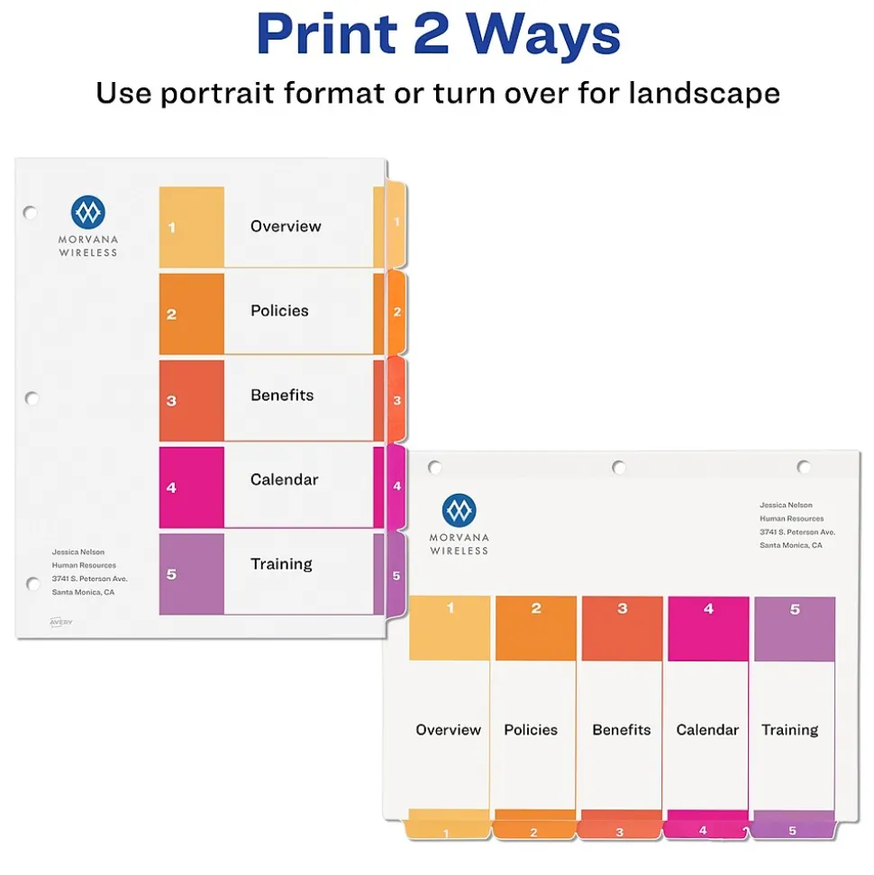 Organize your projects in moments with Avery Ready Index 5-tab dividers.Each tab is preprinted and uniquely color coded for a professional appearance. Print your own custom section titles and images onto the table of contents sheet without worrying about labels or inserts. Whether you’re creating planners for classes or hosting a presentation, these dividers are ideal for getting everything sorted.24 sets of 5 tabbed dividers are included with each sheet measuring 8-1/2″x11″.The 3 binder holes are reinforced on both sides of the heavyweight sheet to prevent creasing and tearing. Each divider tab includes additional reinforcement along the edge of each page to distribute stress and resist folding.The printable table of contents is dual compatible with both laser and inkjet printers. This sheet can also be printed in either portrait or landscape so that your projects can be displayed in any orientation. Just flip the sheet to view the other layout on the opposite side. Try out free templates for these dividers and check out the Avery Design & Print software at avery.com/templates.