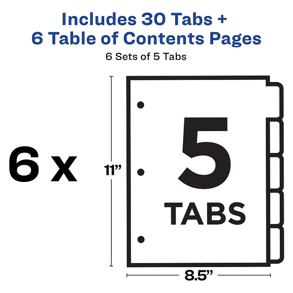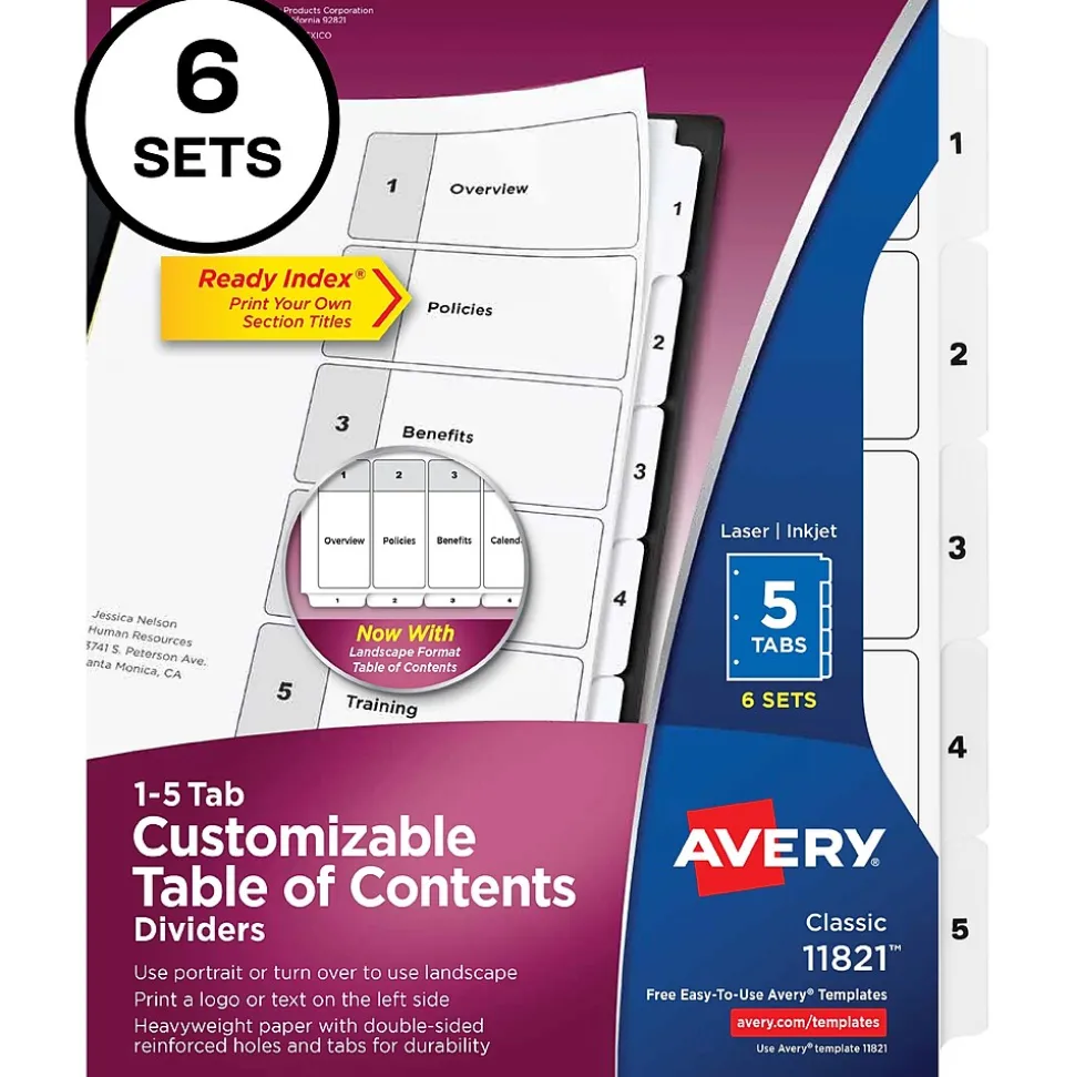 Organize your projects in moments with Avery Ready Index binder dividers.Each white tab is preprinted for a professional appearance. Print your own custom section titles and images onto the table of contents sheet without worrying about labels or inserts. Whether you’re creating planners for classes or hosting a presentation, these dividers are ideal for getting everything sorted.6 sets of 5 dividers are included with each sheet measuring 8-1/2″x11″. The 3 binder holes are reinforced on both sides of the heavyweight sheet to prevent creasing and tearing. Each divider tab includes additional reinforcement along the edge of each page to distribute stress and resist folding.The printable table of contents is dual compatible with both laser and inkjet printers.This sheet can also be printed in either portrait or landscape so that your projects can be displayed in any orientation.Just flip the sheet to view the other layout on the opposite side.Try out free templates for these dividers and check out the Avery Design & Print software at avery.com/templates