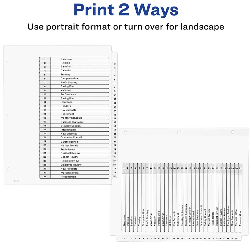 Organize your projects in moments with Avery Ready Index binder dividers. Each white tab is preprinted for a professional appearance. Print your own custom section titles and images onto the table of contents sheet without worrying about labels or inserts. Whether you’re creating planners for classes or hosting a presentation, these dividers are ideal for getting everything sorted.1 set of 31 dividers are included with each sheet measuring 8-1/2″x11″. The 3 binder holes are reinforced on both sides of the heavyweight sheet to prevent creasing and tearing. Each divider tab includes additional reinforcement along the edge of each page to distribute stress and resist folding.The printable table of contents is dual compatible with both laser and inkjet printers. This sheet can also be printed in either portrait or landscape so that your projects can be displayed in any orientation. Just flip the sheet to view the other layout on the opposite side. Try out free templates for these dividers and check out the Avery Design & Print software at avery.com/templates.