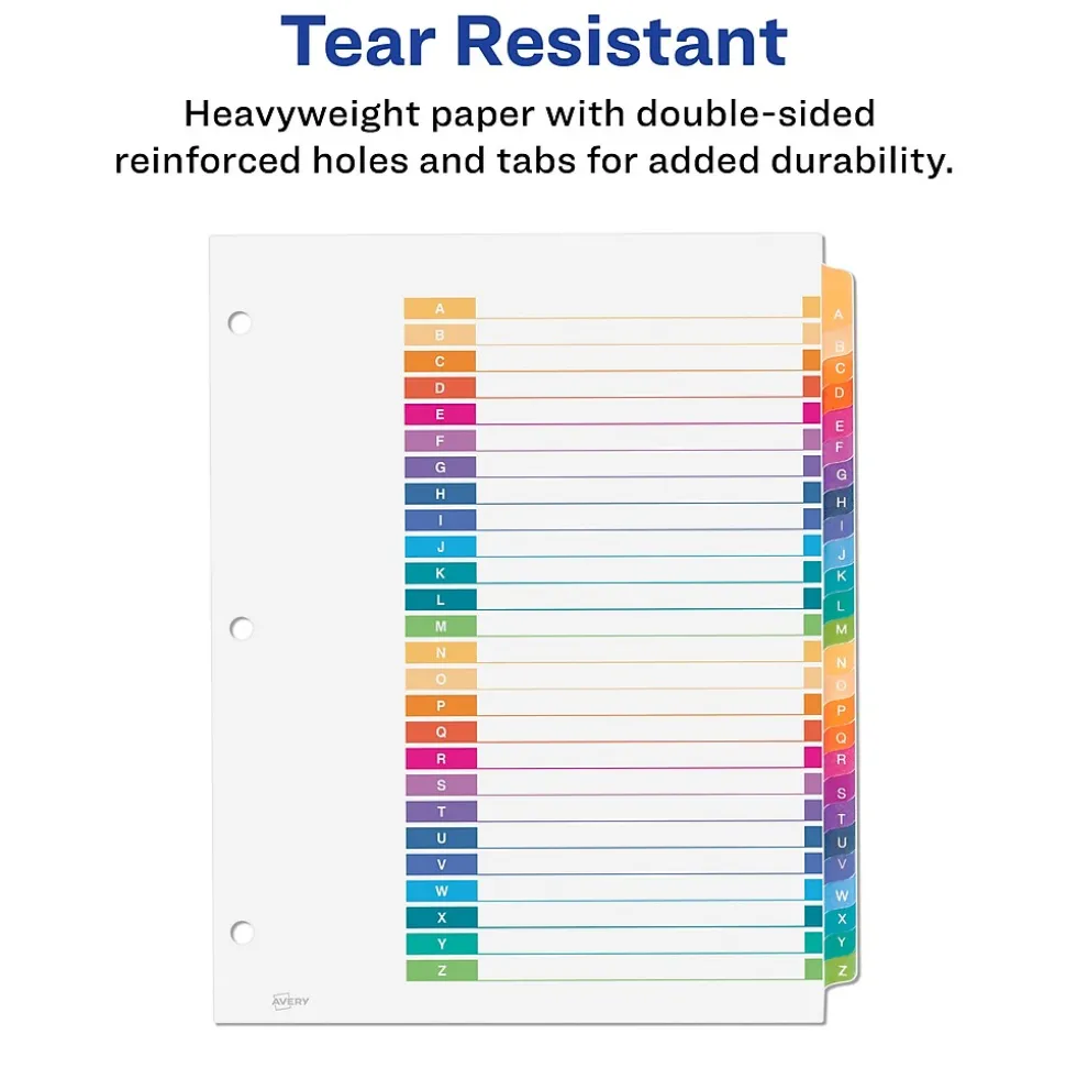 Organize your projects in moments with Avery Ready Index A-Z dividers. Each tab is preprinted and uniquely color coded for a professional appearance. Print your own custom section titles and images onto the table of contents sheet without worrying about labels or inserts. Whether you’re creating planners for classes or hosting a presentation, these dividers are ideal for getting everything sorted.1 pack of 26 alphabet dividers are included with each sheet measuring 8-1/2″x11″. The 3 binder holes are reinforced on both sides of the heavyweight sheet to prevent creasing and tearing. Each divider tab includes additional reinforcement along the edge of each page to distribute stress and resist folding.The printable table of contents is dual compatible with both laser and inkjet printers. This sheet can also be printed in either portrait or landscape so that your projects can be displayed in any orientation. Just flip the sheet to view the other layout on the opposite side. Try out free templates for these dividers and check out the Avery Design & Print software at avery.com/templates.