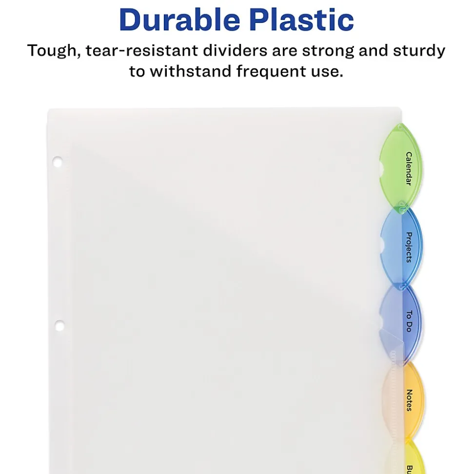 With these Insertable Style Edge Plastic Dividers with Pockets you get a fashionable look, easy referencing and extra storage all in one. The wide design works perfectly with sheet protectors so that you can still view your tabs at a glance. Each binder divider with tabs is made of durable, tear-resistant PVC-free plastic, ideal for 3-ring binders with frequently referenced documents. Style Edge divider tabs give your dividers a modern look with a unique oval tab shape and are designed to keep your inserts locked in during use, while the sturdy pockets can be used for storing loose papers. Sturdy and built to withstand everyday use, this set of translucent 5-tab binder dividers is great for organizing schoolwork, personal finances, recipes, coupons, sheet music, or anything else that needs sorting. These plastic dividers are 3-hole punched and ready for immediate use. For a clean, professional look, personalize your page tab inserts using free templates, fonts and designs on the Avery site. Inserts are compatible with laser and inkjet printers.