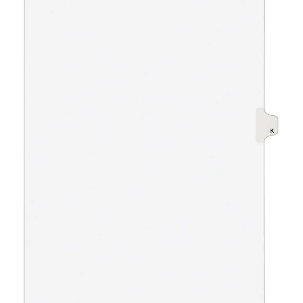 Avery® Tab K alphabetical individual set in white color is perfect choice to organize your index briefs, legal exhibits, mortgage documentation files and more.