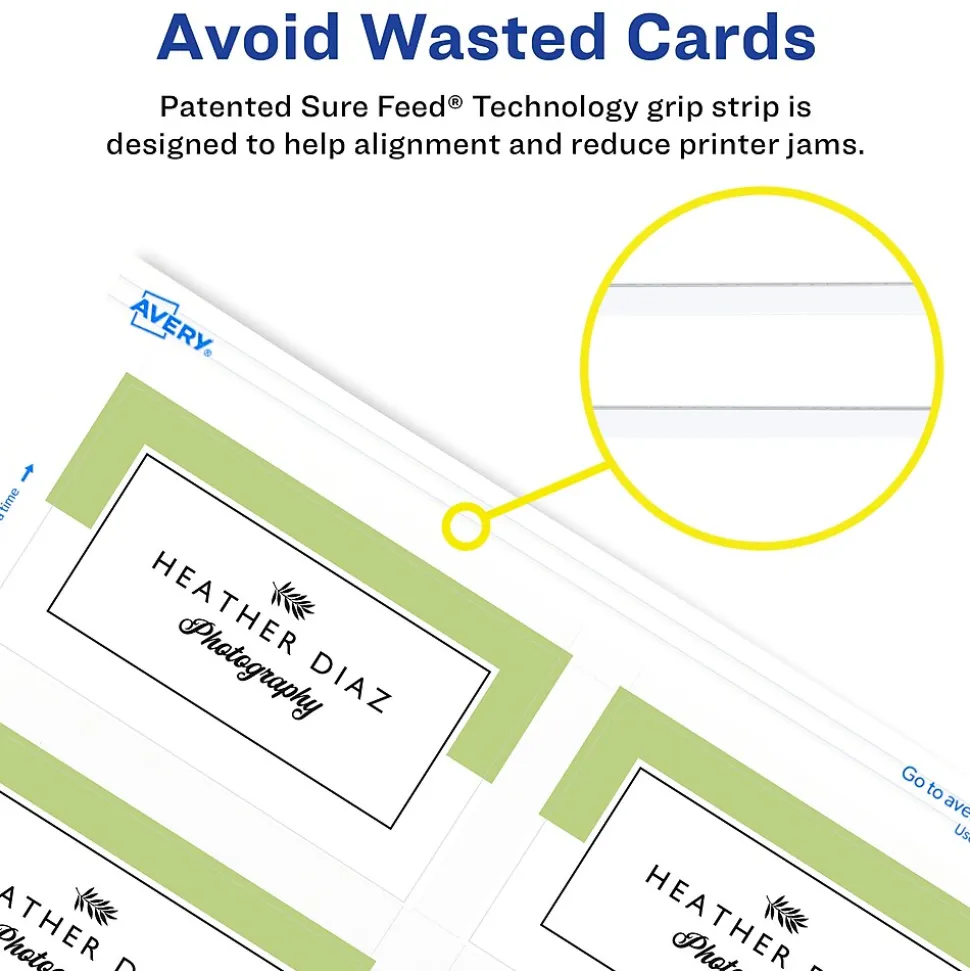 - Each sheet of Avery cards features proprietary Sure Feed technology that provides extra grip to help guide sheets through the printer for improved alignment and fewer wasted cards