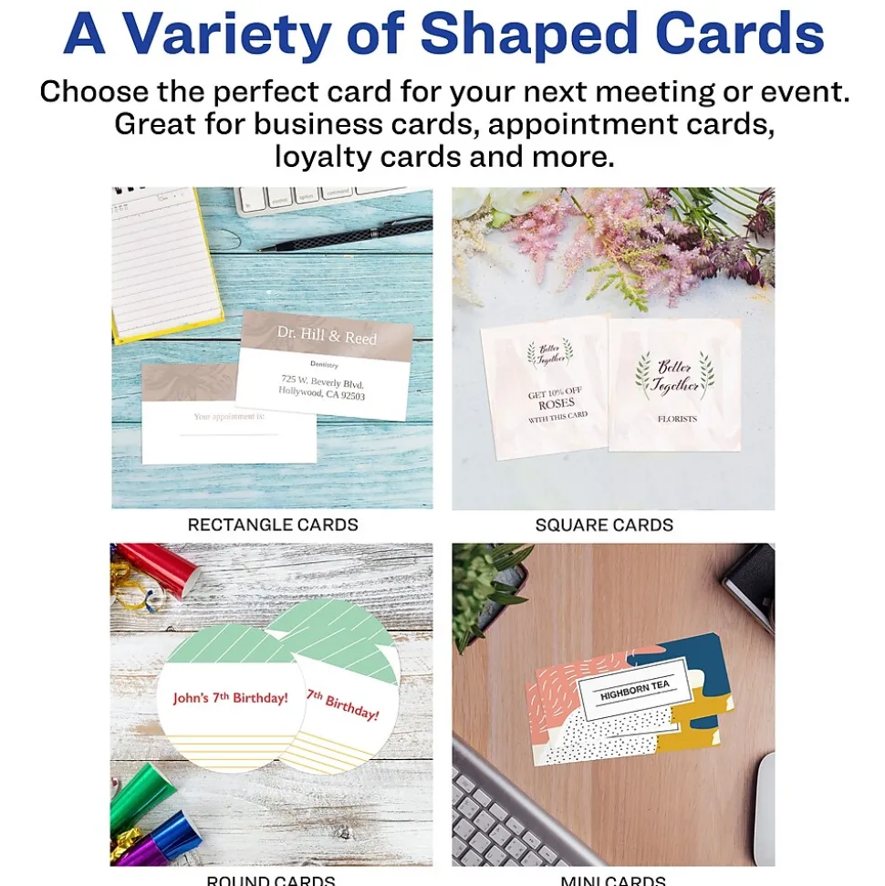 - Create a stunning first impression with these glossy white business cards to create DIY business cards, thank you cards, appointment cards and coupon cards with the templates on the Avery website