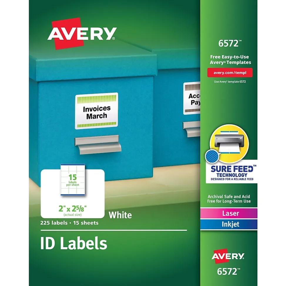Identify ownership of equipment and property with labels that are built to last. These durable labels stand up to frequent use, and with permanent adhesive they’re guaranteed to stick and stay. Labels are archival safe and acid free to prevent yellowing and deterioration over time. Customize your labels with free designs and templates at avery.com/templates. These ID Labels feature Sure Feed(R) technology for a more reliable feed through your printer to help prevent misalignments and jams—and that means no more wasted labels. Ideal for labeling containers, bins, shelving, and as id labels for office equipment, property ID labels and other assets.