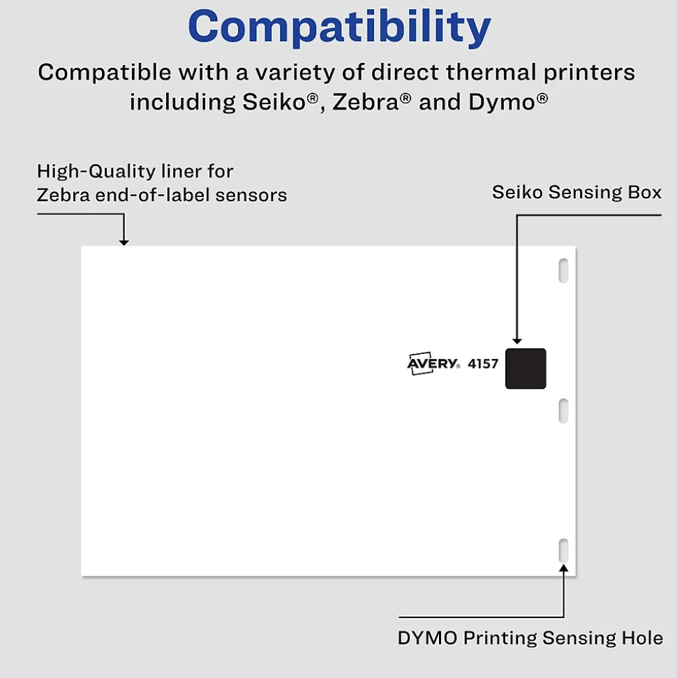 - Compatible with a variety of direct thermal printers including DYMO®, Seiko® and Zebra®; label comparable to DYMO 1744907