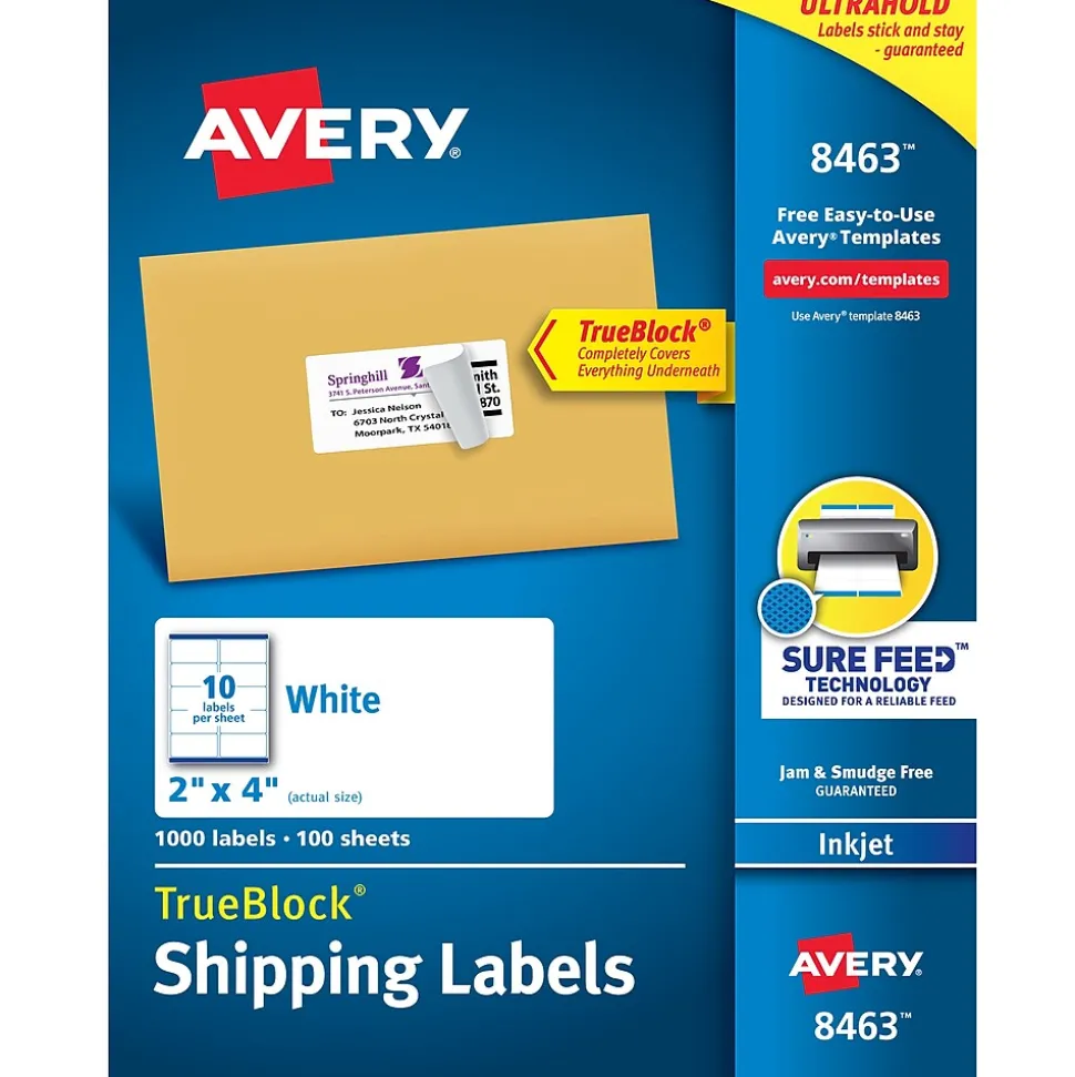 Stock up the mailing room or office with these white inkjet shipping labels. The TrueBlock feature prevents text and images beneath the label from showing through, and with 1000 labels, each box makes it easy to take on high-volume mailing tasks. Free templates from Avery Design & Print let you print custom text and images onto these Avery TrueBlock white shipping labels. These printable labels feature Sure Feed technology, designed for a reliable feed through your inkjet printer, preventing misalignments and jams.