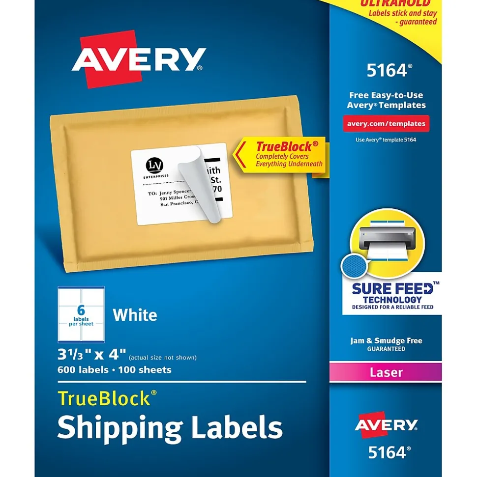 Tackle large shipping tasks with these white shipping labels. With 600 in a box, these labels are ideal for high-volume offices, while the customizable format lets you add logos, images, and other graphics. These Avery TrueBlock shipping labels have a jam-free, smudge-free design for smooth and simple shipping and are compatible with most laser printers, so you can get started right away. These labels also feature exclusive Avery Sure Feed technology to improve print alignment and avoid jamming.