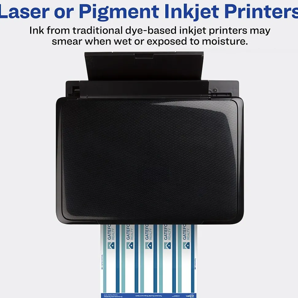 - Waterproof when used with laser or pigment-inkjet printers; traditional dye-based inkjet printers may smear when wet