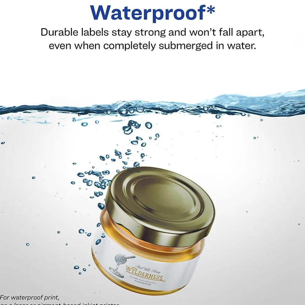 Customize and add a personal touch to your bottles, products and projects with matte white Avery 22845 Durable Waterproof Labels. Branding your water bottles is made easy with these printable 1.25″ x 9.75″ waterproof white labels that won’t fall apart even when submerged in water and features a polyester that resists oil and grease preventing smudging and smears. Great for use as baby bottle labels, mason jar labels, wine bottle labels, spray bottle labels and other curved applications with the flexible label solution. Our print-to-the-edge capability allows you to create eye-catching full bleed labels with sharp text and crisp images printed right to the edge with no border or margin. Sure Feed technology reduces jams or smudges by creating a more reliable feed through your printer. A strong permanent adhesive is used to make sure that these blank white labels stick and stay firm to most smooth surfaces, including paper, cardboard, plastic, glass, metal and more, without lifting, curling or falling off. Effortlessly create beautiful, customized sticker labels with your own text, photos and images or use Avery Design & Print. Our free browser-based software has everything you need to design candle labels, beer bottle labels, gift label stickers, product labels, decorative mailing labels and more. Try it out today on the Avery site. Please Note: Waterproof when used with laser or pigment-based inkjet printers. Ink from traditional dye-based inkjet printers may smear when wet or exposed to moisture.