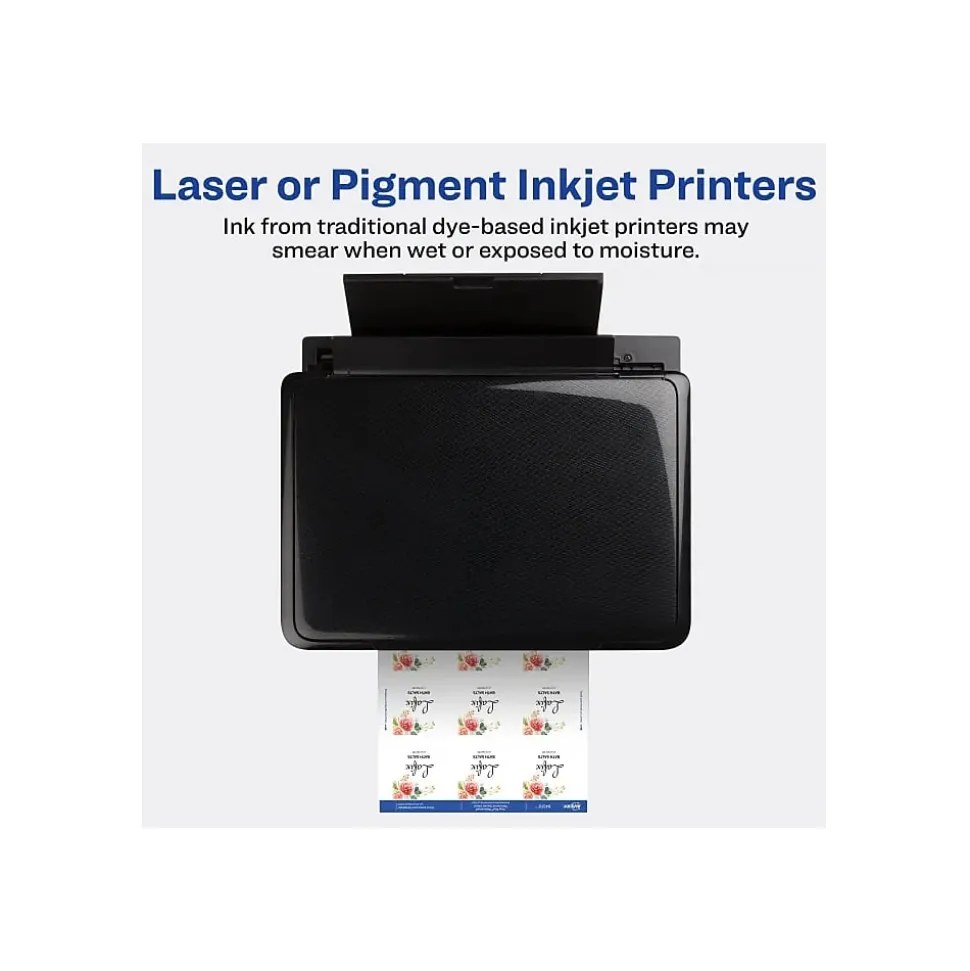 - Waterproof when used with laser or pigment-inkjet printers; traditional dye-based inkjet printers may smear when wet