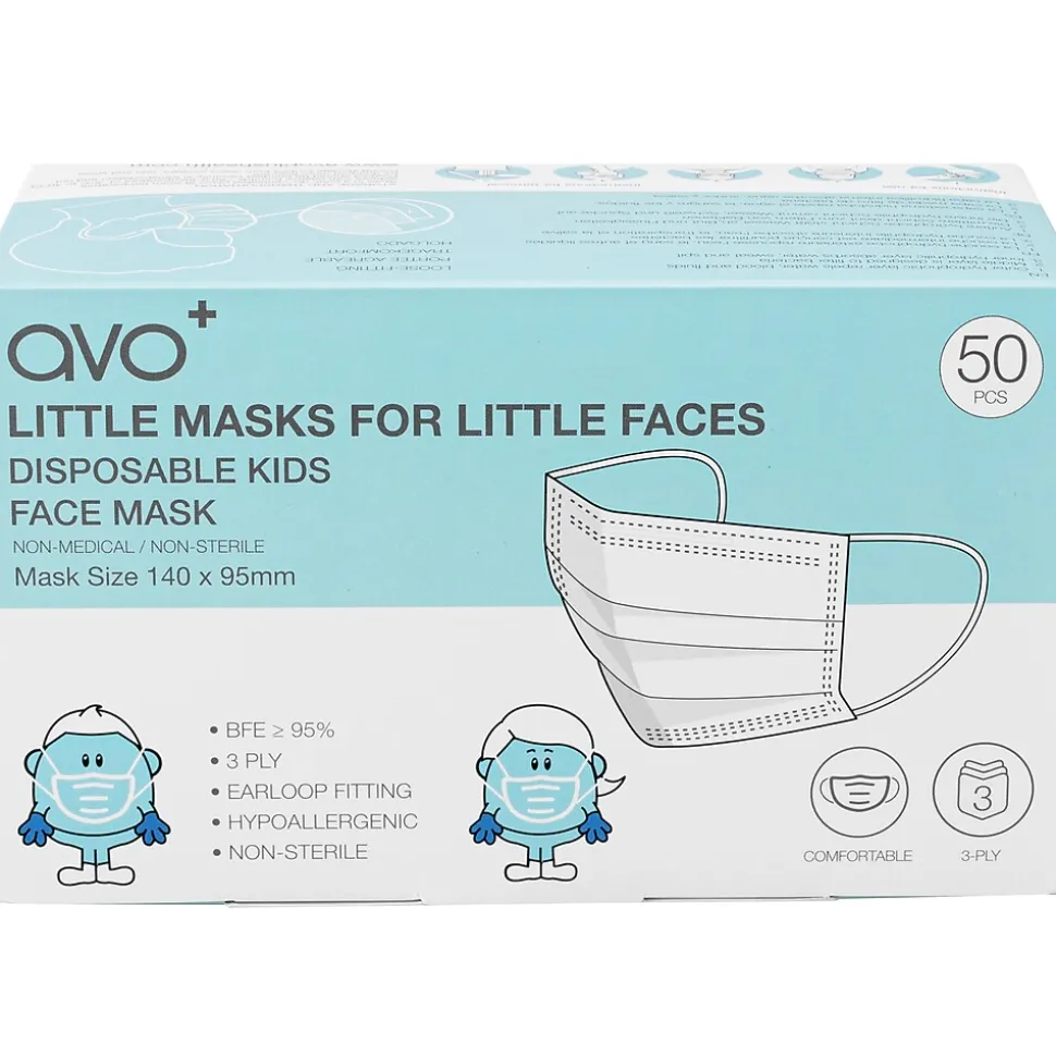 AVO+ disposable single-use face mask for kids with ear loops. The mask features a three-layer construction: the top and liner layers are PP nonwoven, the middle layer is a high-performance filter cloth. The ear loops are finished in a thicker, more comfortable elastic material. Designed with youngster-friendly packaging, but suitable for smaller faces of any age.