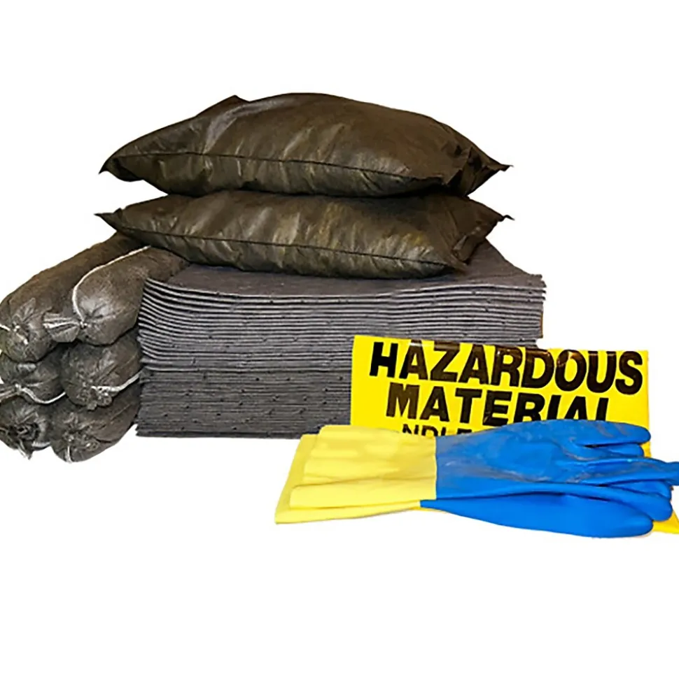 - 52-piece kit includes 15″ x 19″ universal spill pads (40 pcs.), 3″ x 4′ universal sorbent socks (3pcs.), 18″ x 18″ universal sorbent pillows (2 pcs.), chemical gloves (1 pc.),disposal bags (5 pc.)