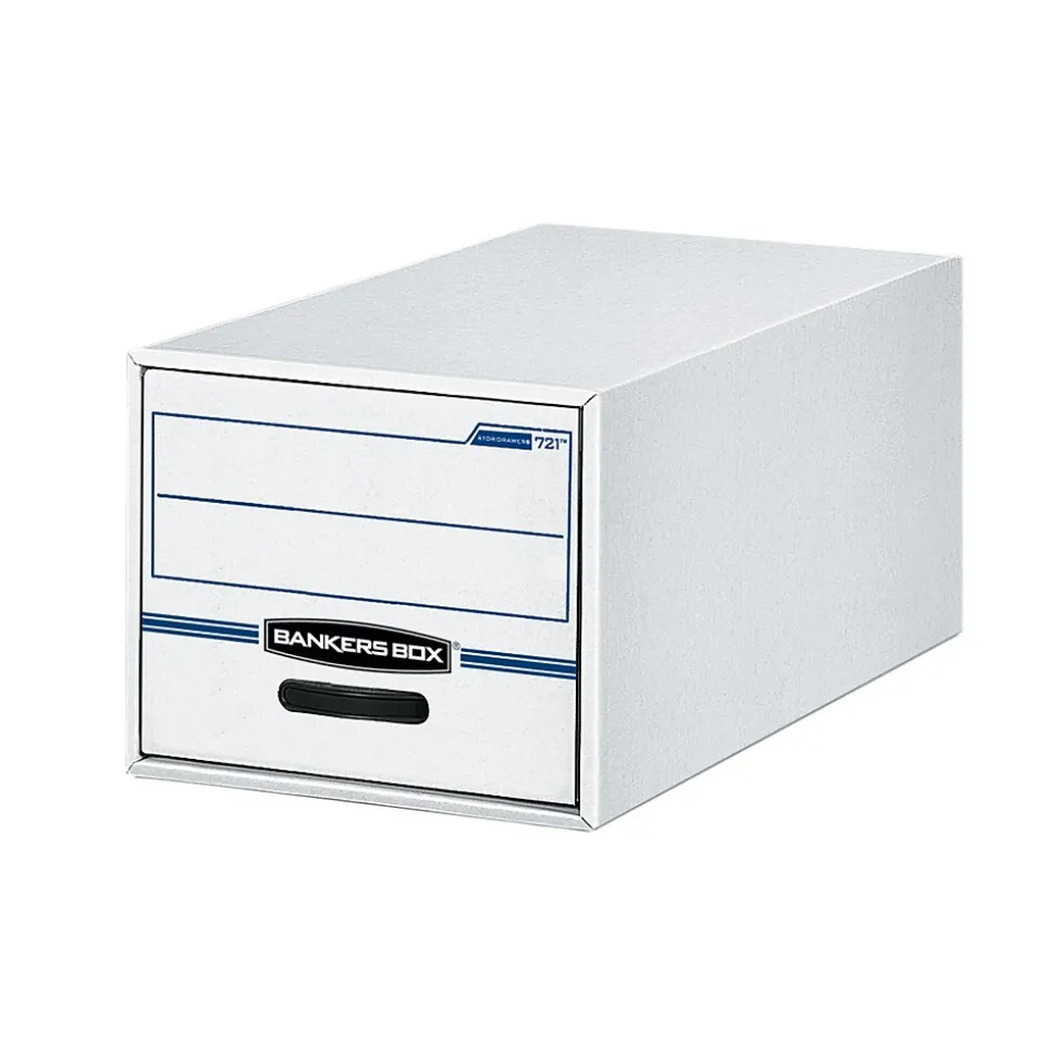 Create an efficient storage system for essential files with this letter-size drawer. The front and back panels are reinforced to provide durability and the strength to withstand heavy use, while the built-in plastic handle makes accessing contents quick and simple. This Bankers Box Stor/Drawer storage drawer accommodates letter-size documents and can be stacked up to two units high to save valuable floor space.