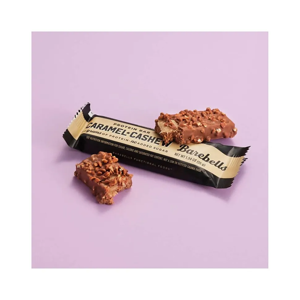 - Protein bar with a gooey caramel core enclosed in a chocolaty cover with real cashew nut chunks