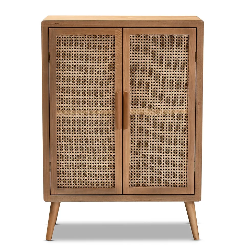 Cultivate a fresh, retro feel in any space with the Alina cabinet. This sturdy wood cabinet showcases a medium oak finish for a look that’s both warm and inviting. Two shelves, behind two doors, provide ample space to keep items organized and out of sight. Woven rattan adds a cool, bohemian vibe, while angled legs and long wooden handles lend mid-century charm. The Alina cabinet is made in China and requires assembly.This is a product of nature and may have variations in areas such as, but not limited to, color, pattern, grain and texture. The hair-like strands of rattan/rattan-fiber are common due to nature of the material.