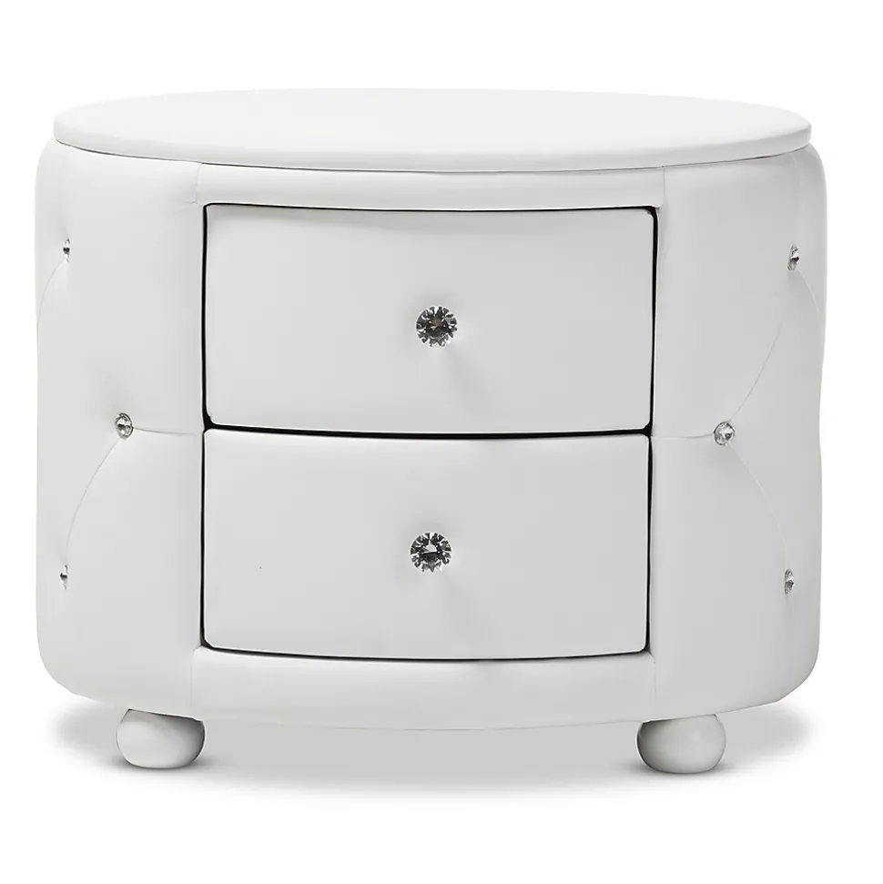 Inspired by Hollywood glamour modern design, the Davina nightstand is an icon of modernization. Constructed of solid rubberwood and plywood, this oval-shaped bed side table is fully upholstered in white faux leather for a smooth surface with a matching MDF top. Faux crystal buttons are tufted throughout to create a blink-blink visual effect. Marry style and function with this beautiful bedside table. With two spacious drawers, this will help organizing your bedroom accessories. Faux crystal knobs and the matching wooden legs will instantly attract all of your guests’ attentions. Made in Malaysia, the nightstand will arrive fully assembled.