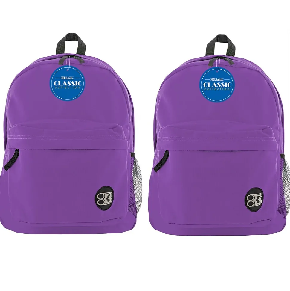 This 17″ school bag features 2 compartments and a bottle pocket: one large compartment mainly for larger items such as text book, binders, and laptops, the other compartment is a smaller compartment located in front, mainly for smaller items, such as cell phones, keys, and hand sanitizer. Both compartments have zipper closure. The bottle holder is on one side of the backpack. There are 2 adjustable shoulder straps nicely padded for comfort when carrying the backpack. There are 2 zipper pulls for the large compartment, and 1 zipper pull for the smaller compartment. There is a nylon handle on top of the backpack, convenient for hanging the backpack on hook outside of classrooms, or any hanger. Bazic Products’ logo is stitched in the front, on the bottom right of the small compartment for recognition. Sold as a pack of 2 backpacks.