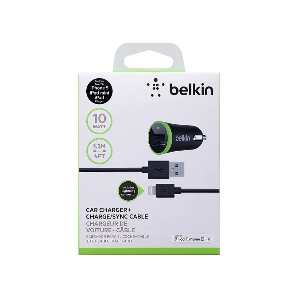 Charge devices with this convenient charger and cable that plugs into a cigarette car port. This Belkin car charger has a 4-foot lightning sync and charge cable, designed to power various Apple devices at the fastest possible speed.