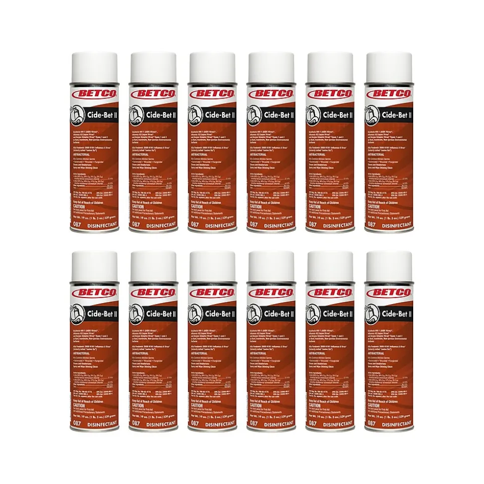 This Betco Cide-Bet II easy-to-use foaming germicidal detergent cleans, disinfects, and deodorizes in one quick operation. A hospital-type disinfectant, this product kills a broad range of microorganisms including staph, salmonella, and pseudomonas. Virucidal against HIV-1 (AIDS virus) and herpes simplex 1 and 2. Effective fungicidal activity against pathogenic fungi, mold, and mildew. Powerful detergent action quickly removes a wide variety of soils and will not harm most surfaces. This product destroys odors at their source, leaving a fresh and clean fragrance behind.