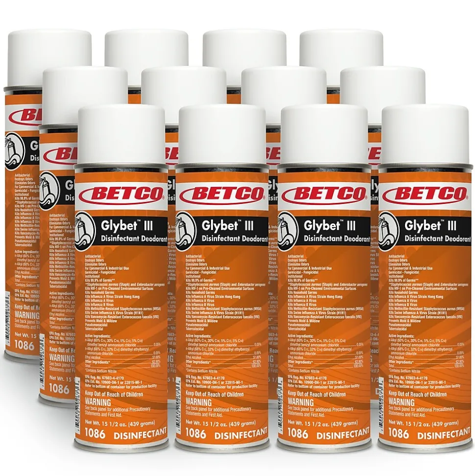 Betco Glybet III delivers disinfecting and deodorizing performance in an economical ready-to-use aerosol. It is formulated for use in daily maintenance programs to disinfect and deodorize in one labor-saving step. Perfect for use in the daily maintenance of restroom fixtures, garbage cans, and more in hospitals and households. This tuberculocidal disinfectant is intended for use on hard nonporous surfaces.