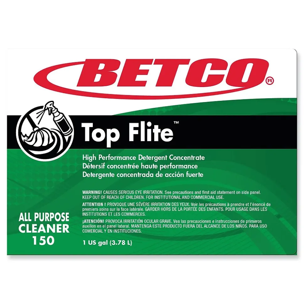 Clean and deodorize most water-washable surfaces with this advanced formula. Betco® Top Flite is formulated without butyl or inorganic phosphates, and therefore it will not harm most surfaces. Great for mop and bucket, spray, or sponge applications.