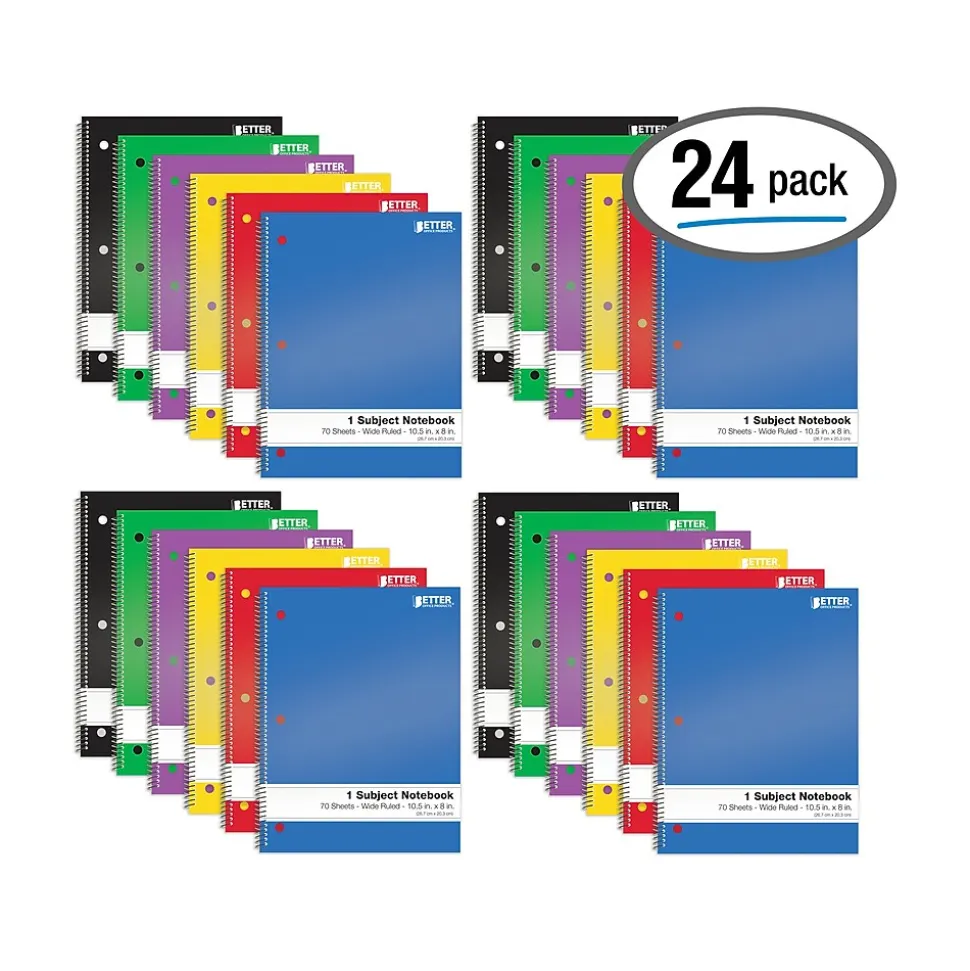 Better Office 1-Subject Notebooks, 8″ x 10.5″, Wide Ruled, 70 Sheets, 24/Pack (25624-24PK)