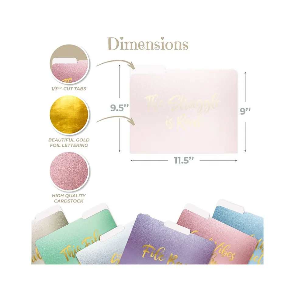 The Better Office Gold Foil Popular Sayings fashion file folders come in six colorful designs featuring fun sayings. Printed on heavyweight (300 gsm) paper with a clear-coated finish for added durability and sheen. The 1/3-cut tabs allow a sizable amount of space for customization. Use in the office or at home to brighten your workspace and personalize your project folders.