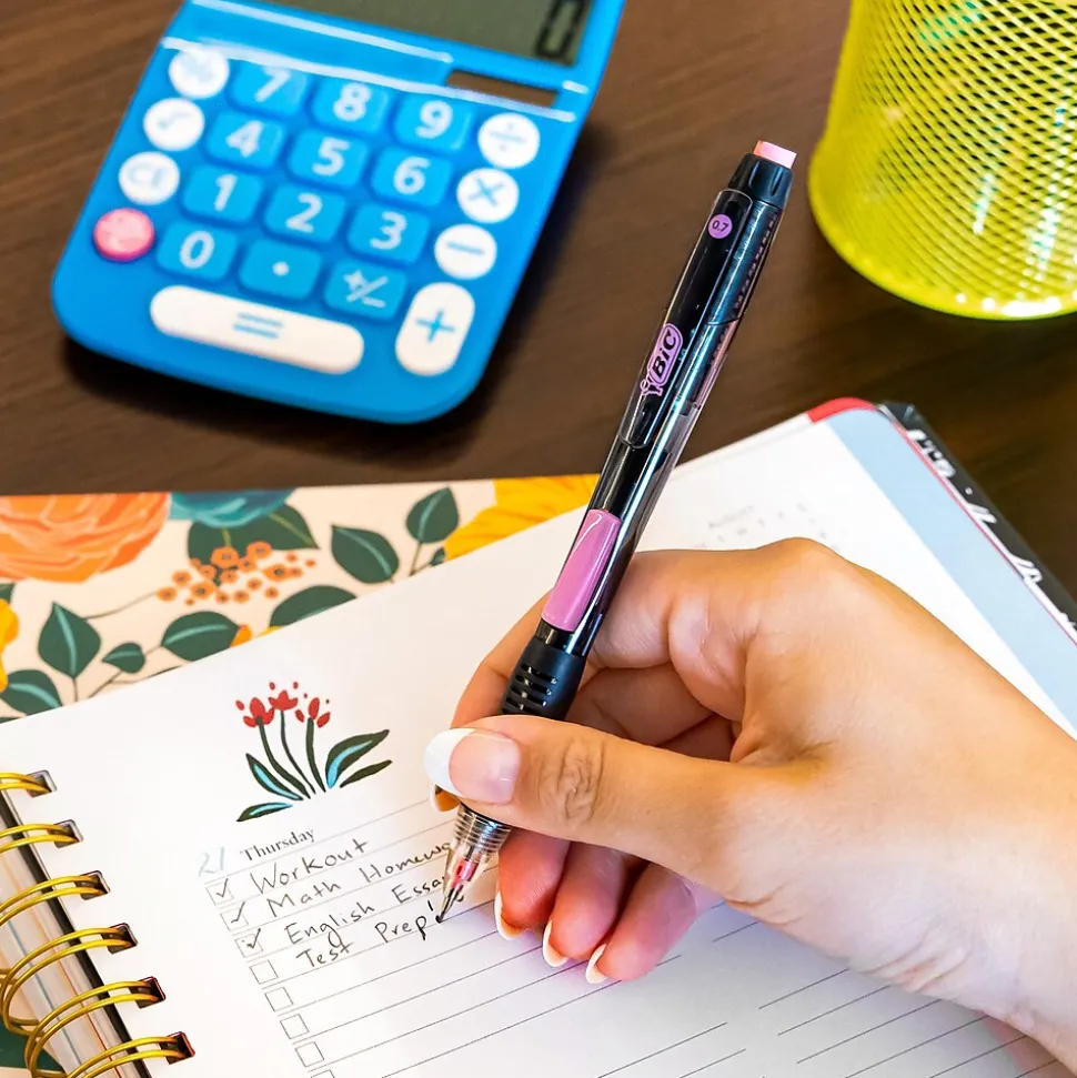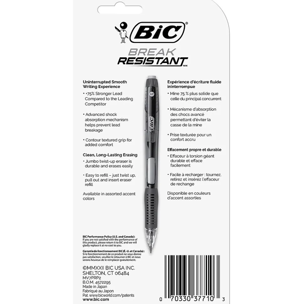 No more broken leads. Enjoy a smooth, uninterrupted writing experience with the BIC Break-Resistant mechanical pencils, thanks to the specially formulated 0.7mm lead and an innovative shock-absorption mechanism that has a 75% stronger lead. Crafted with thoughtful design from top to bottom, the BIC Break-Resistant mechanical pencil is the tool for any type of writing from jotting down a simple shopping list to composing long-form letters, drafting professional documents to taking standardized tests, and everything in between. The pack includes extra break-resistant leads and two replacement jumbo erasers for easy editing. Available in six cool and fun colors, including gray, green, purple, pink, yellow and blue, the BIC Break-Resistant mechanical pencils are as good-looking as they are functional. Avoid the frustration of flimsy lead that snaps easily and requires constant replacement with the BIC Break-Resistant mechanical pencils to go the distance and last as long as your inspiration.