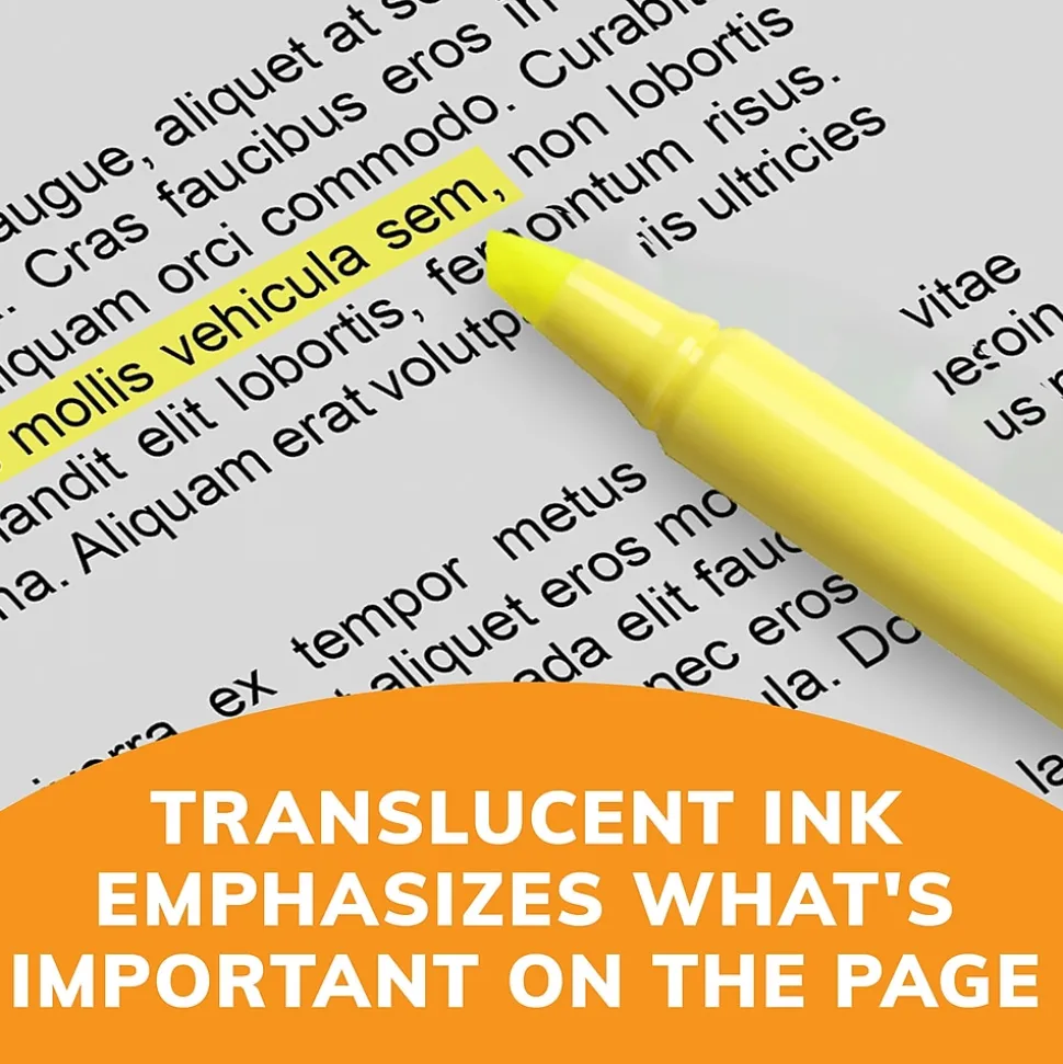 BIC Briteliner Highlighters offer a splash of color to any educational setting. With a chisel tip, these highlighter pens are perfect for both broad highlighting and fine underlining, making them ideal classroom highlighters. Teachers and students alike will appreciate their long-lasting ink that writes up to eight hours without drying out, even when the highlighter cap is left off. These highlighter markers come in an assortment of vibrant colors including yellow, pink, blue, green, and orange, ensuring that your notes stand out. The pen-shaped design provides a comfortable grip, making them easy to use for extended periods. Add a touch of flair to your school supplies with these reliable and colorful highlighters.