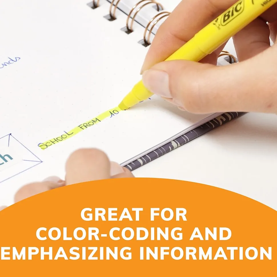 Whether you’re organizing your notes or underlining passages in a textbook, BIC Brite Liner Highlighters make highlighting fun and easy. These highlighters come in five highly visible, fluorescent colors, like our iconic yellow highlighters, allowing you to easily color-code and emphasize information. Each highlighter has a versatile, firm chisel tip that allows you to seamlessly switch between broad highlighting and precise underlining. BIC Brite Liner Highlighters can be left uncapped for up to eight hours without drying out. And thanks to their convenient pen-shaped design, these fluorescent highlighters are easy to grip and use.