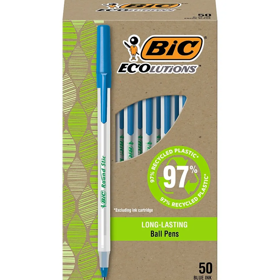 - One package contains 50 BIC Ecolutions Round Stic Blue Ballpoint Pens