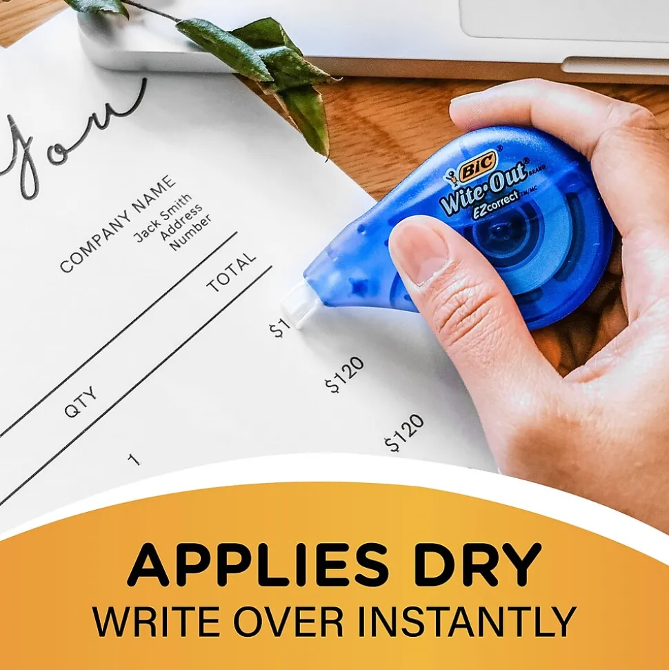 Quickly correct typed or handwritten documents with BIC White-Out Brand EZ Correct Correction Tape. Made by America’s #1 Correction Brand*, this correction tape goes on dry, allowing you to make instant corrections with no mess and no waiting time unlike the correction fluid white out liquid. Dispensing the tape is easy: simply hold the dispenser with your thumb in the groove, position the tip flat on your paper, press down firmly, and gently move from left to right. Offering greater strength than paper-based tape, this film-based correction tape is more tear resistant to create tidy, inconspicuous corrections that last. The self-winding mechanism helps prevent the tape from loosening, so you can apply the tape smoothly and accurately. And thanks to its translucent body, the dispenser lets you see how much tape is remaining.