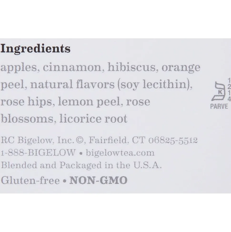 - Ingredients: apples, cinnamon, hibiscus, orange peel, natural flavors (soy lecithin), rose hips, lemon peel, rose blossoms, licorice root