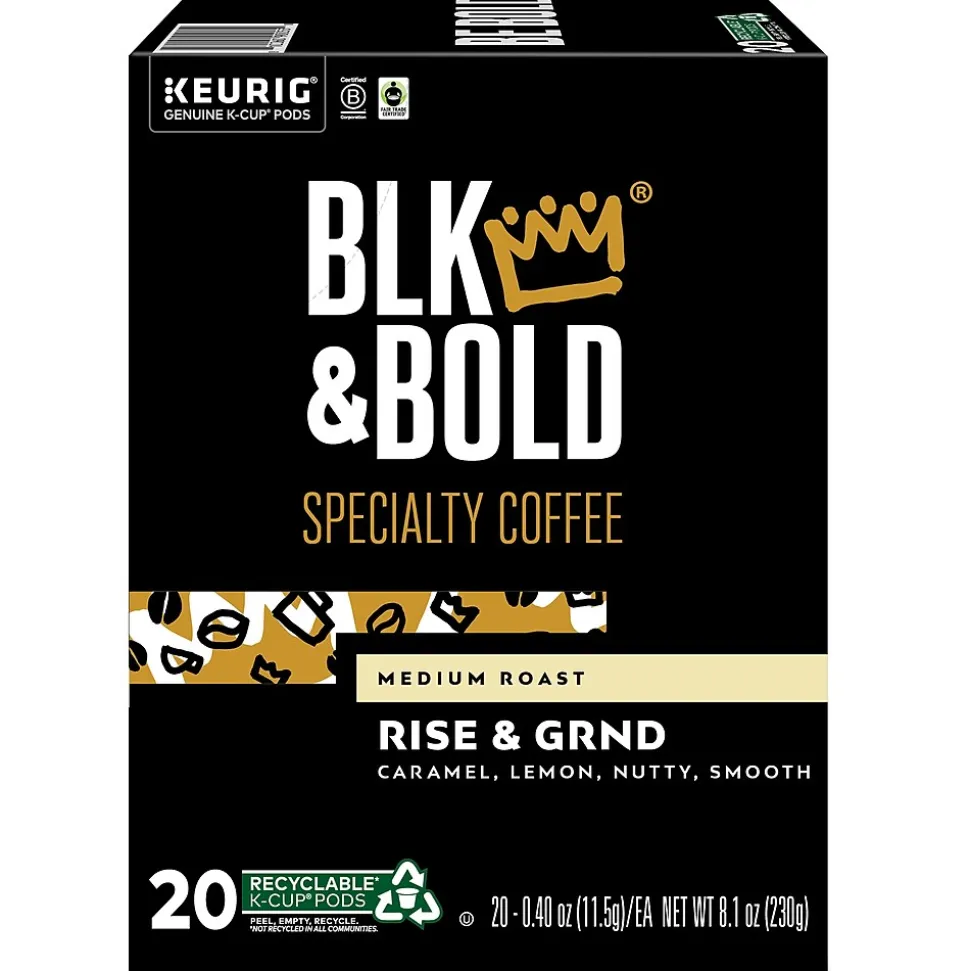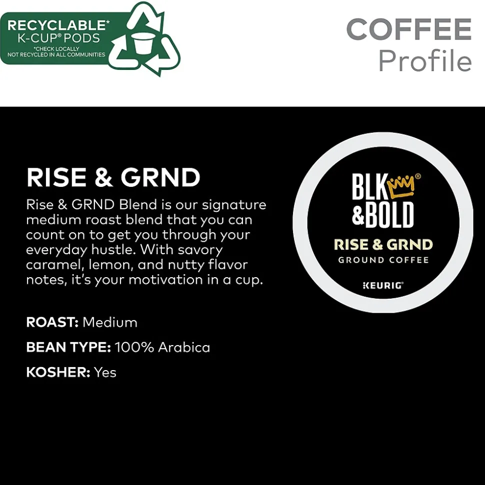 The Keurig BLK & Bold Rise & GRND signature lifestyle coffee blend is now available in K-cups. Get ready to Rise & GRND with this sweet and creamy medium roast blend in a convenient and delicious cup of coffee. Rise & GRND is dedicated to making the hustle possible. The blend’s washed process before roasting helps produce a versatile cup with savory toffee and nutty flavor notes and a bit of lemon. This BLK & Bold coffee is Fair Trade Certified.