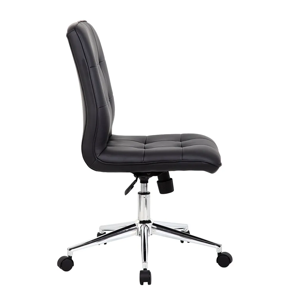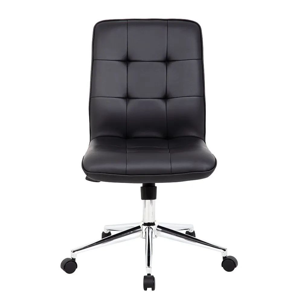 Enjoy a comfortable, stylish seating experience with this Boss Millennial modern office chair. The CaressoftPlus upholstery brings a luxurious feel to this chair, while the button-tufted accents add a handsome finishing touch. The polished five-star base and rolling casters make it easy to wheel your way from your desk to a nearby file cabinet or printer stand. This desk chair features soft, contoured padding for added cushion and support, so you can put in long hours without muscle stress and strain. With pneumatic seat height adjustment, spring tilt and upright tilt lock, this Boss Millennial modern office chair lets you customize the setup to meet your personal preferences.