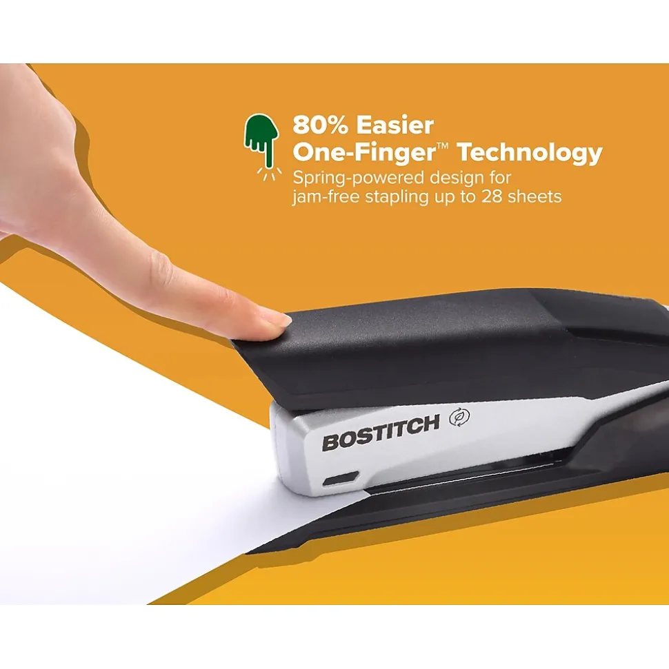 With One-Finger™ Stapling Technology by Bostitch Office, all it takes is a finger to get the job done. Our inPower™ eco-friendly stapler boasts a long-lasting sleek, die-cast metal body that provides the eye candy your desk craves, all while being eco-friendly with a construction made from 70% post-consumer recycled plastic. The easy stapling of up to 28 sheets, along with the ergonomic non-slip comfort grip and base, provide the luxury you deserve. Using standard staples, it also works jam-free and opens for bulletin board tacking. Perfect for home, school, or the office – experience a better way to staple while making a positive impact on the environment