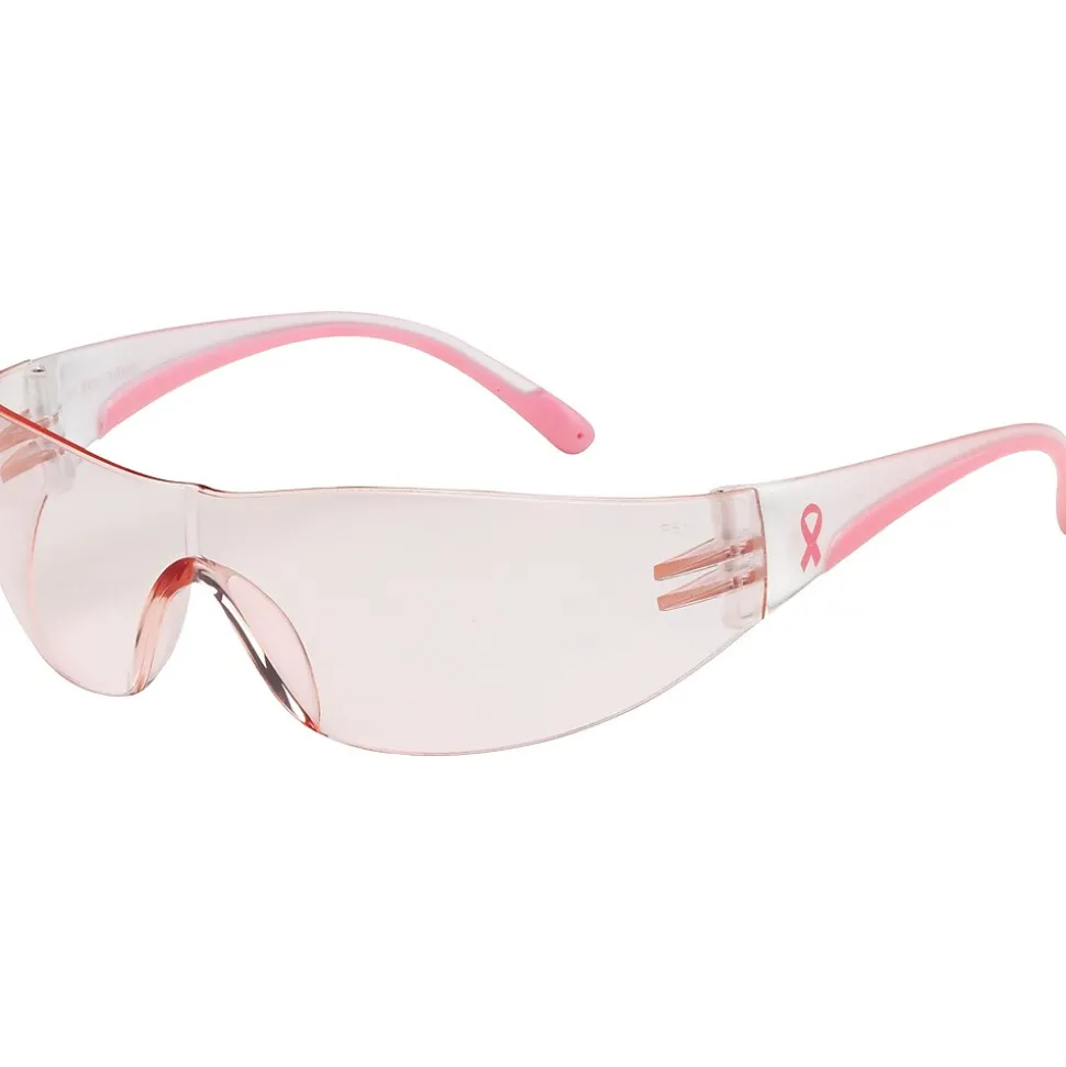 Bouton Optical Eva Safety glasses with pink/clear frame have larger lens that are coated with anti-scratch and lightweight, rimless design provides all day user comfort. Glasses have pink rubber co-molded temples to provide secure fit.
