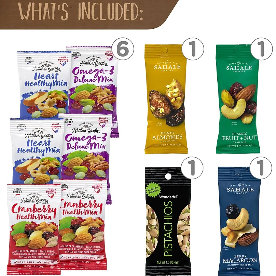 Forget those sugary snacks at the office and grab a bag from this Healthy Mixed Nuts Snack Box. With deliciously good-for-you brands like Nature’s Garden, Sahale, and Second Nature, you’ll enjoy all kinds of nuts and dried fruits like almonds, peanuts, pistachios, cashews, cranberries and raisins. Snack healthier with the wide assortment of this mixed nut snack box! Perfect for the office break room for a mid afternoon snack, or at home for an on the go snack when running around!