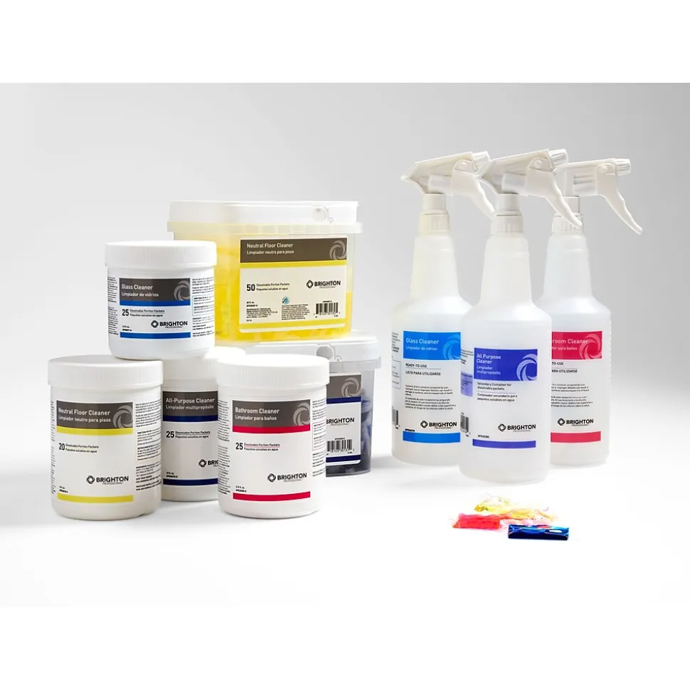 The Brighton Professional™ Dissolvable Portion Packet system combines a concentrated cleaning solution within a water-soluble film. No need to cut, tear, or pour! Simply drop a whole packet into a quart spray bottle and add cold water. It dissolves in minutes, creating a precisely diluted mixture of cleaning solution without spills, mess, or waste.