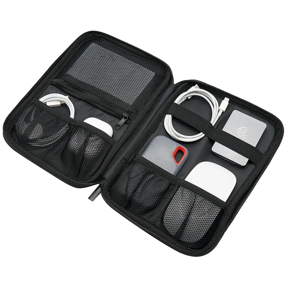 The Brookstone tech accessory organizer features several mesh pockets for easy organization of all your tech essentials. The organizer has plenty of room for your items, while looking sleek when closed. Slight padding protects your hardware and electronic accessories.