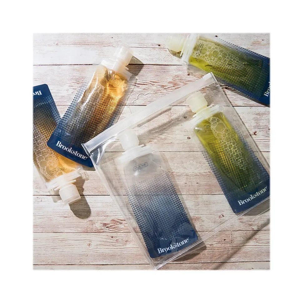 This Brookstone six-piece travel liquid pouch set includes five TSA-compliant 3 fl. oz. easy-fill tubes with a reusable storage case. The soft pouch design allows for easy use, so that you can keep using your products until the last drop!