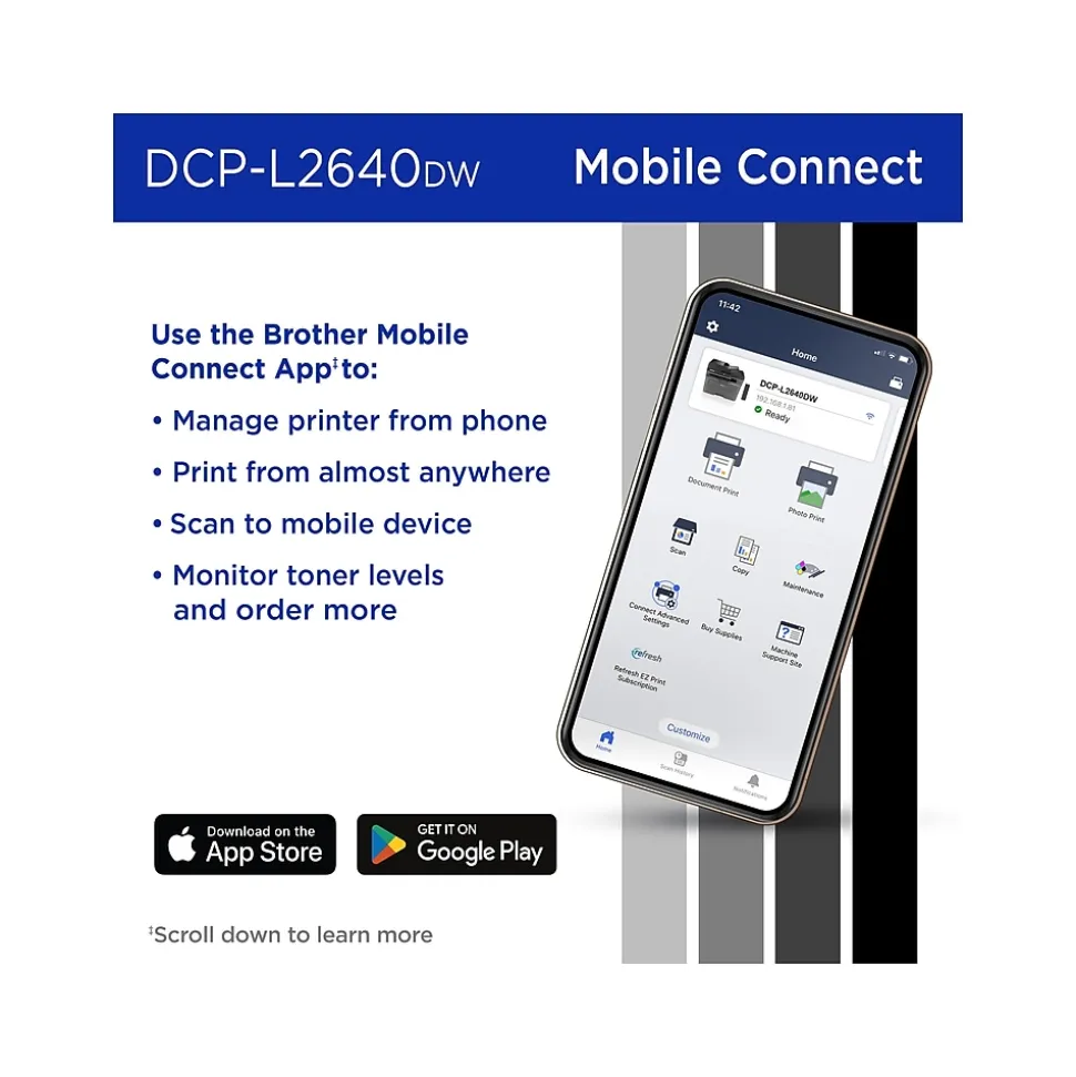- PRINT FROM VIRTUALLY ANYWHERE. Print, scan, and manage your printer anytime, from almost anywhere with the Brother Mobile Connect app. Order Brother Genuine Supplies, track toner usage, and complete more work on-the-go.(6)